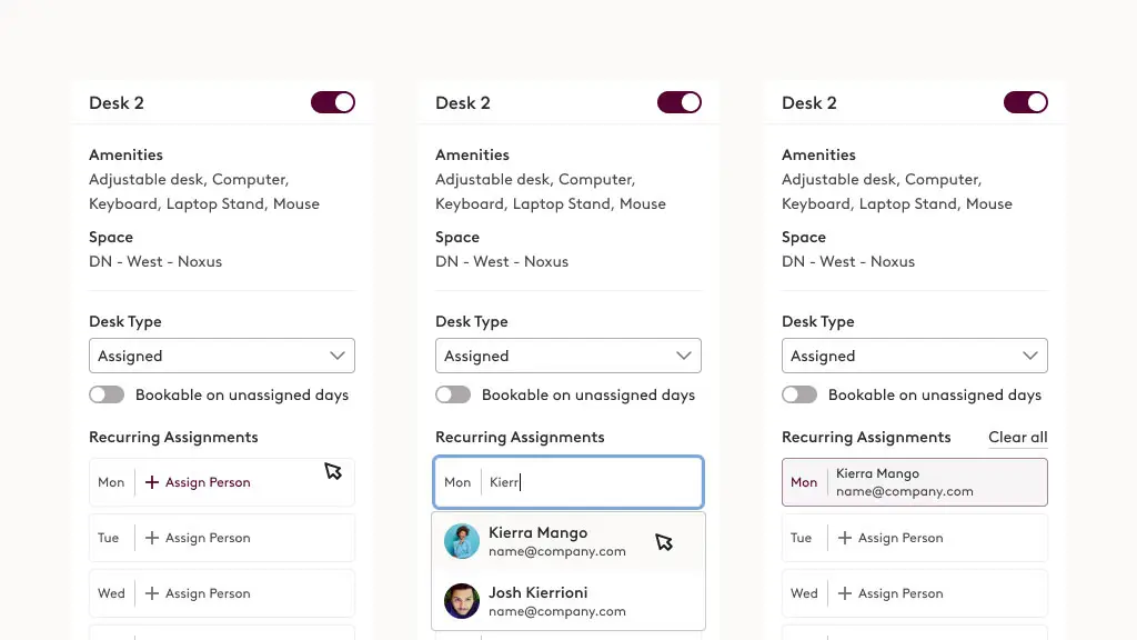 As companies embrace 2/3 or 3/2 attendance schemes, it has become necessary to find more adaptable systems that allow multiple employees to share a single desk on a dynamic, recurring weekly schedule. This has led to office administrators seeking efficient ways of assigning desks to employees based on their attendance patterns.
