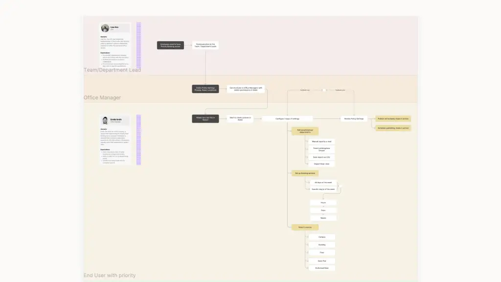 Mapping the user journey wasn’t easy. This feature depends on desk inventory, pass rules, user roles, and team policies, it touches a lot of moving parts.