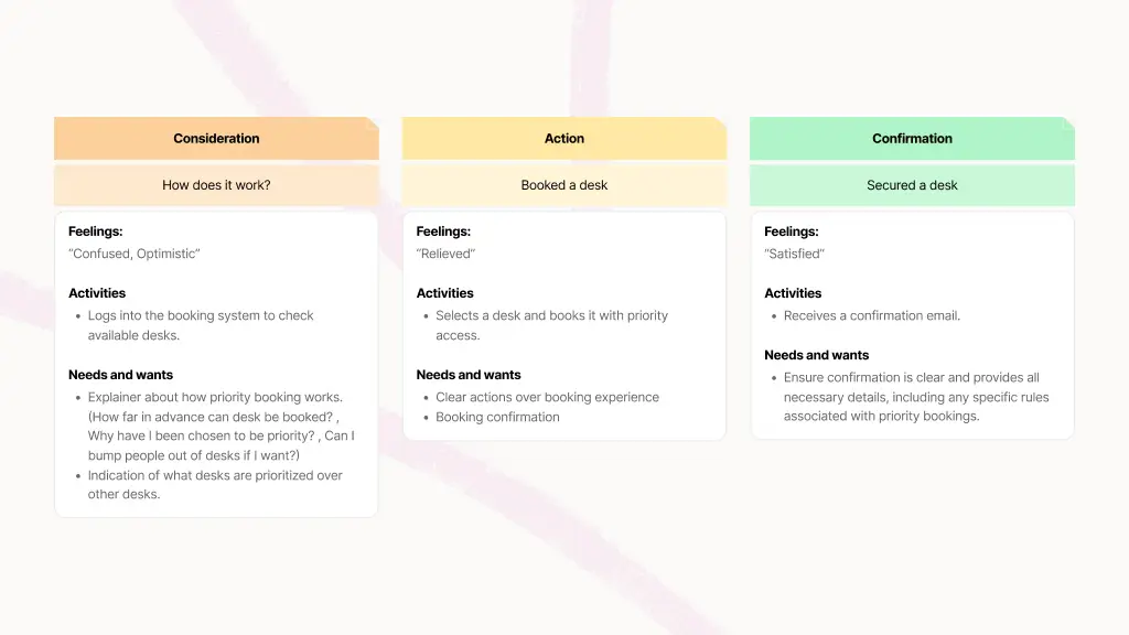 The goal is to make sure the system isn’t just flexible on paper, but actually helping people book the desks they need, when they need them. As part of the discovery, we defined the key metrics we want to track once the feature goes live. These include overall adoption, desk utilisation, and booking lead time.